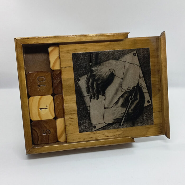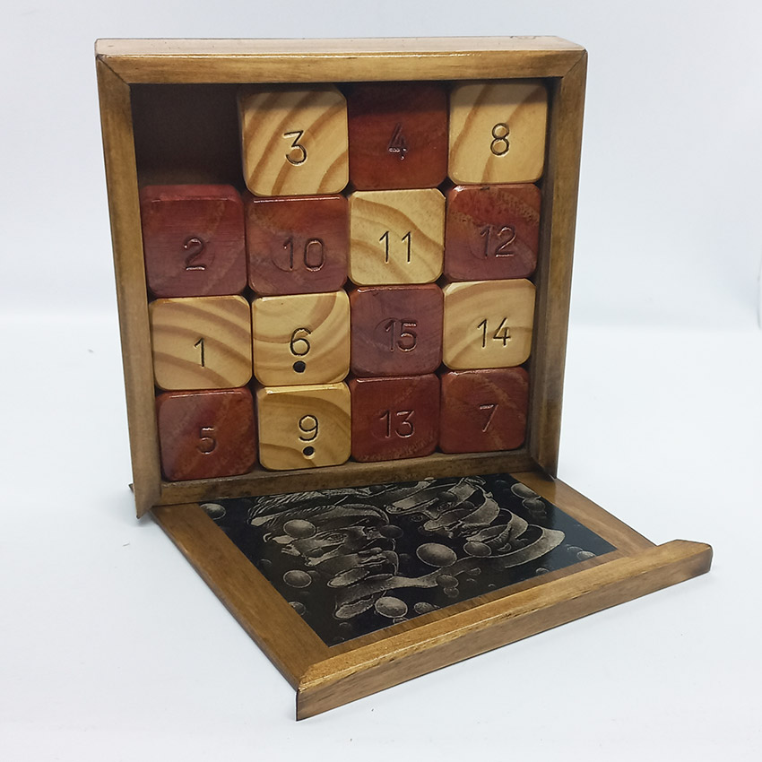 Juego del 15. Juegos de ingenio fabricado artesanalmente en madera de pino, lijado, barnizado y pintado a mano. El juego del 15 o taken es un juego de deslizamiento de piezas que presentan un determinado orden inicial dentro de una cajita cuadrada. Juego de inteligencia y lógica en el que hay que ordenar los números del tablero del 1 al 15 comenzando por la parte superior izquierda. Tiene su origen en Estados Unidos, en el siglo XIX.